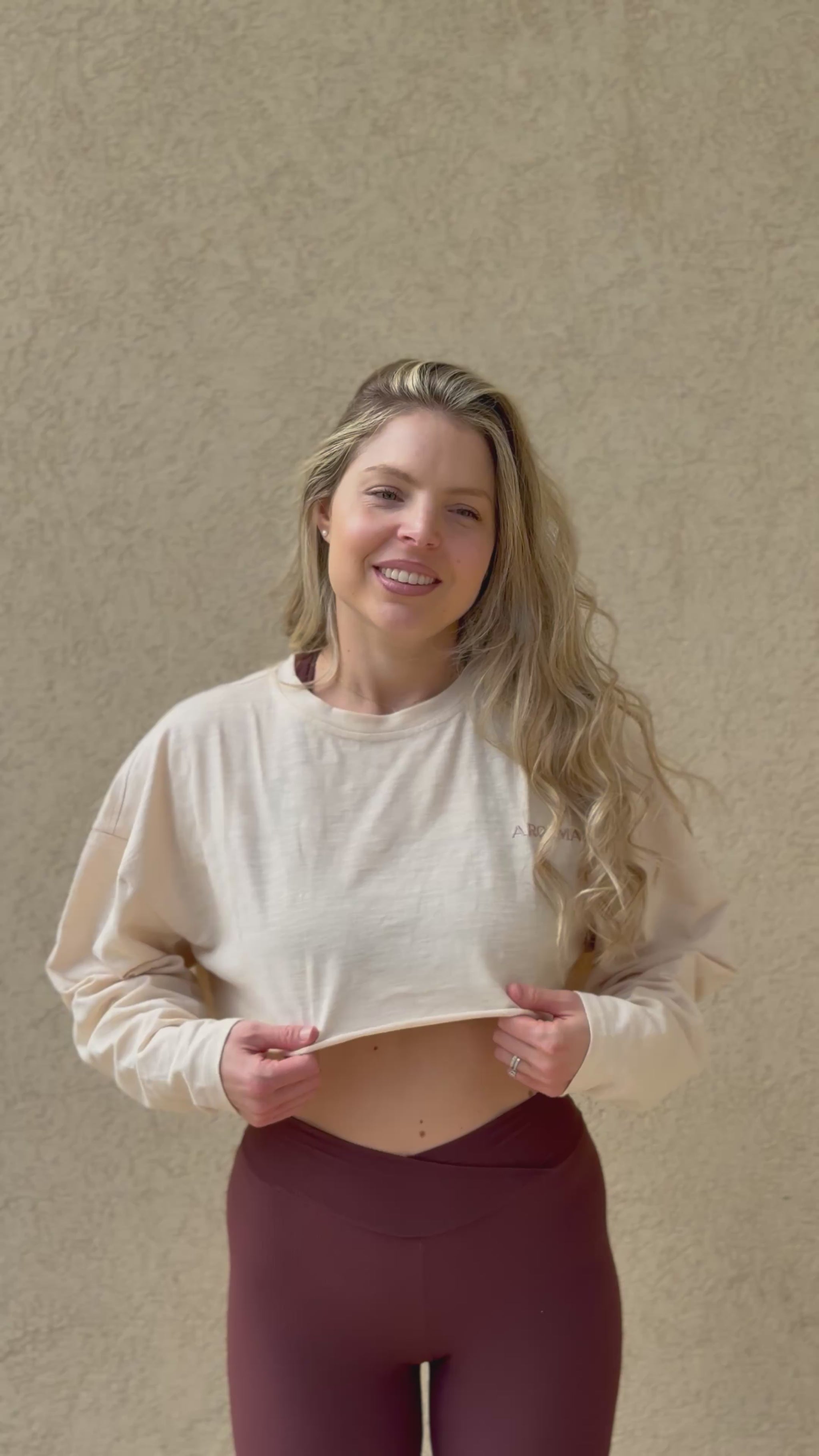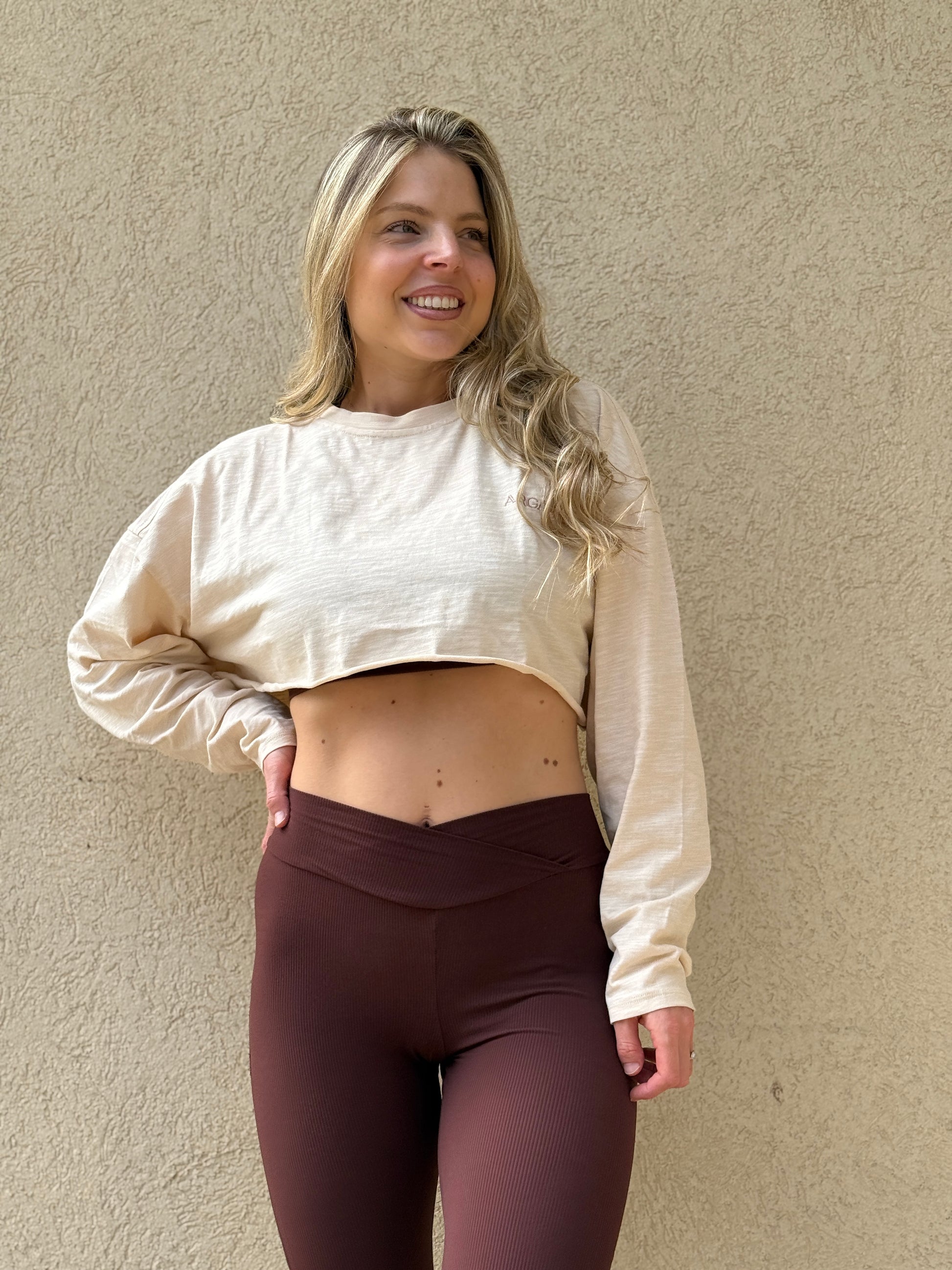 חולצת קרופ קלילה ונושמת עשויה 100% כותנה טבעית ורכה במיוחד בצבע בז׳ שמנת טבעית. הגזרה משוחררת, מחמיאה ומושלמת לאימון קל, לסידורים או ללוק יומיומי נקי ומדויק.